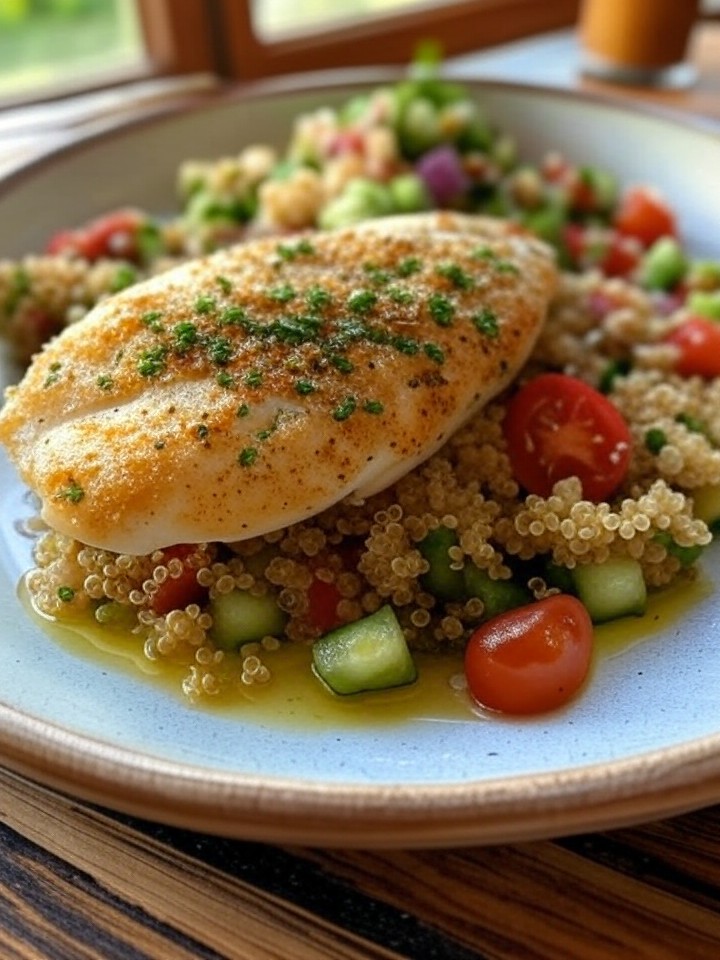 A vibrant dish featuring herb-crusted tilapia accompanied by a refreshingly light quinoa tabouleh, packed with fresh vegetables and citrusy flavors.