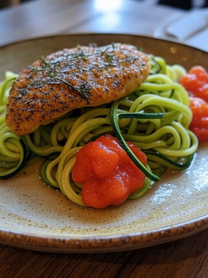 A delightful, aromatic dish featuring a herb-crusted chicken breast paired with fresh zucchini noodles and a tangy tomato olive relish.