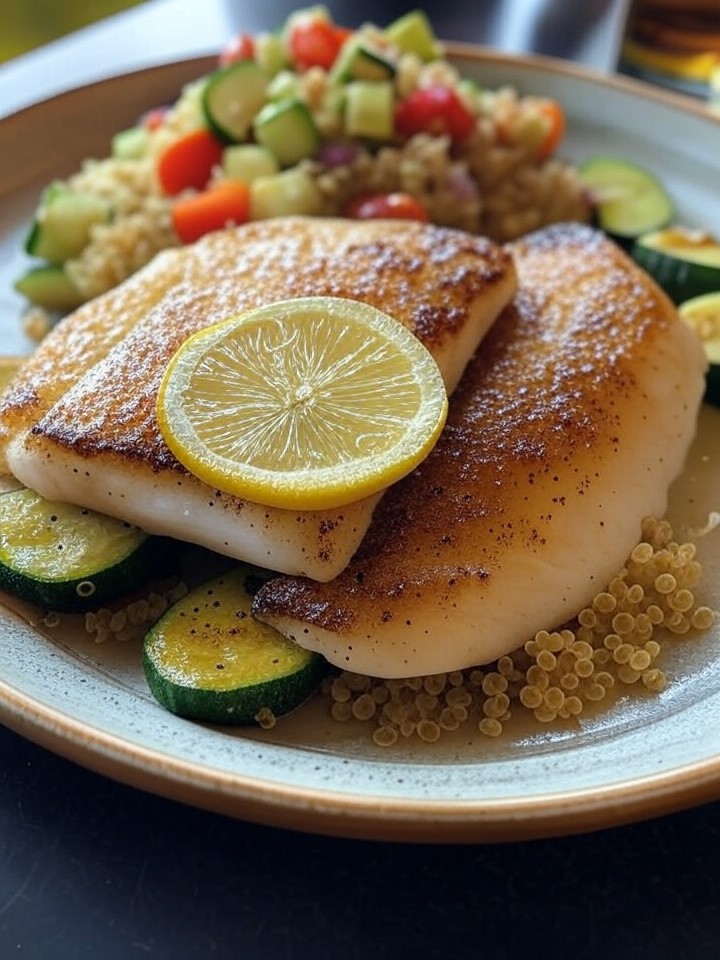 - Plate the tilapia alongside the Mediterranean quinoa salad and sautéed zucchini. Serve immediately.