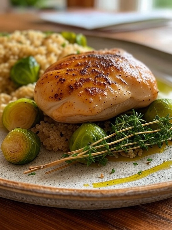 Herb-Roasted Chicken with Caramelized Brussels Sprouts and Quinoa Pilaf